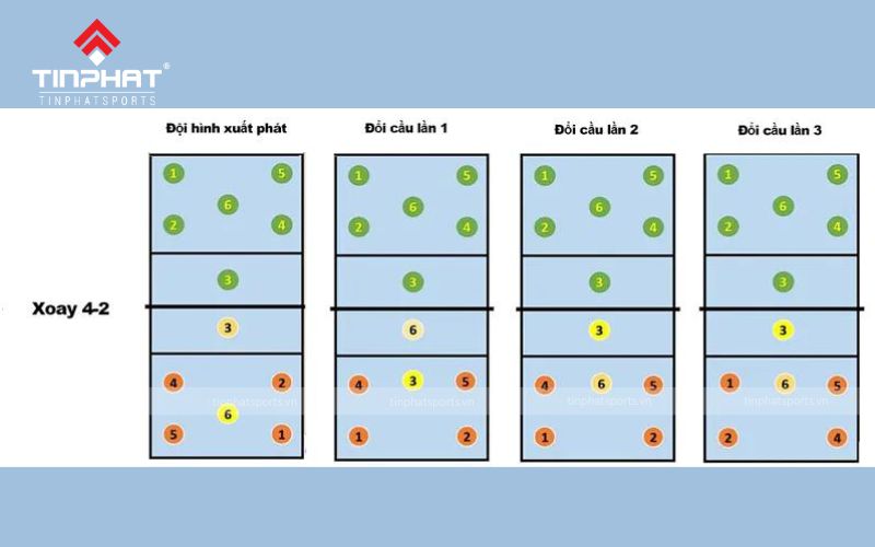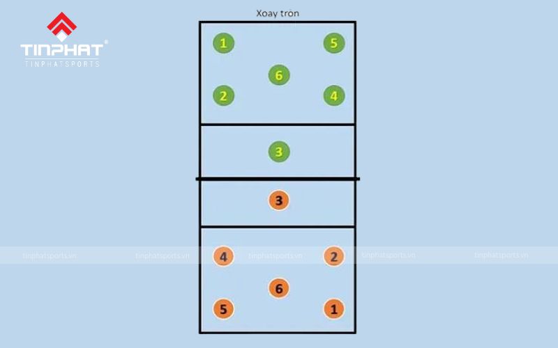 Ví dụ, cầu thủ đang ở vị trí 2 (hàng trước bên phải) sẽ xoay xuống vị trí 1 (người phát bóng). Cầu thủ ở vị trí 1 sẽ xoay xuống vị trí 6 (hàng sau giữa), và cứ thế tiếp tục cho đến khi tất cả các cầu thủ đã di chuyển sang vị trí mới theo chuỗi xoay vòng. Điều quan trọng là việc xoay vòng này chỉ diễn ra một lần duy nhất cho mỗi lượt giành quyền phát bóng. Sau khi xoay vòng và người phát bóng thực hiện xong cú phát, các cầu thủ có thể tự do di chuyển trên sân để bố trí lại đội hình phòng thủ hoặc tấn công mà không bị coi là lỗi vị trí, miễn là họ đã đứng đúng vị trí ban đầu trước khi bóng được phát. Việc tuân thủ nghiêm ngặt thời điểm và quy tắc xoay vòng là tối quan trọng để tránh mất điểm không đáng có và duy trì lợi thế chiến thuật.