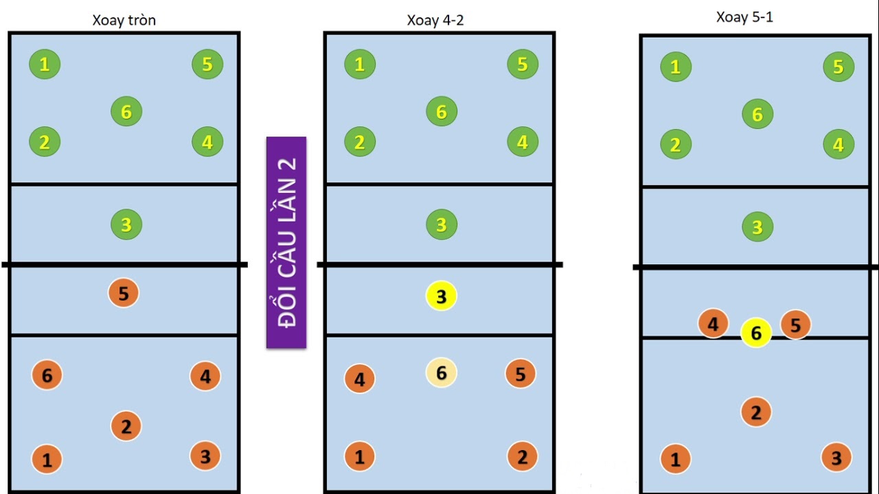 Mỗi khi một đội giành được quyền phát bóng, các cầu thủ phải thực hiện xoay vòng theo chiều kim đồng hồ. Điều này có nghĩa là một chuyền 2 có thể từ hàng sau di chuyển lên hàng trước, hoặc một chủ công từ vị trí biên trái chuyển sang vị trí trung tâm. Sự thay đổi này không chỉ là về mặt vật lý mà còn yêu cầu các cầu thủ phải nhanh chóng thích nghi với vai trò mới của mình trong chuỗi luân chuyển. Việc tối ưu hóa sự di chuyển và phối hợp giữa các vị trí trong quá trình xoay vòng là chìa khóa để duy trì sự cân bằng giữa tấn công và phòng thủ, đồng thời khai thác tối đa điểm mạnh của từng cá nhân để đạt được mục tiêu cuối cùng là ghi điểm và chiến thắng.