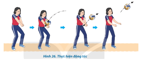 Ngay khi bóng chạm vào cẳng tay, đây là lúc toàn bộ cơ thể phát huy tác dụng. Vận động viên thực hiện động tác đạp mạnh chân xuống đất, đồng thời duỗi thẳng khớp gối và nâng hông lên, đẩy thân người về phía trước và lên trên. Hai cánh tay vẫn giữ thẳng và được khóa khớp khuỷu, di chuyển theo một đường thẳng từ dưới lên trên theo hướng bóng bay mong muốn.