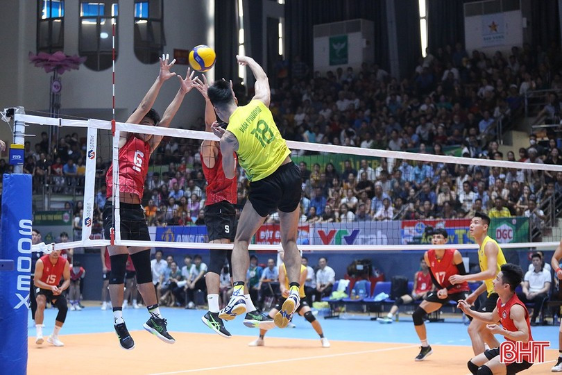 Hình ảnh: Đội bóng Hà Tĩnh thi đấu quyết liệt trước đương kim á quân Biên Phòng tại Giải Bóng chuyền Vô địch Quốc gia 2024, thể hiện quyết tâm và tinh thần thi đấu cao.
