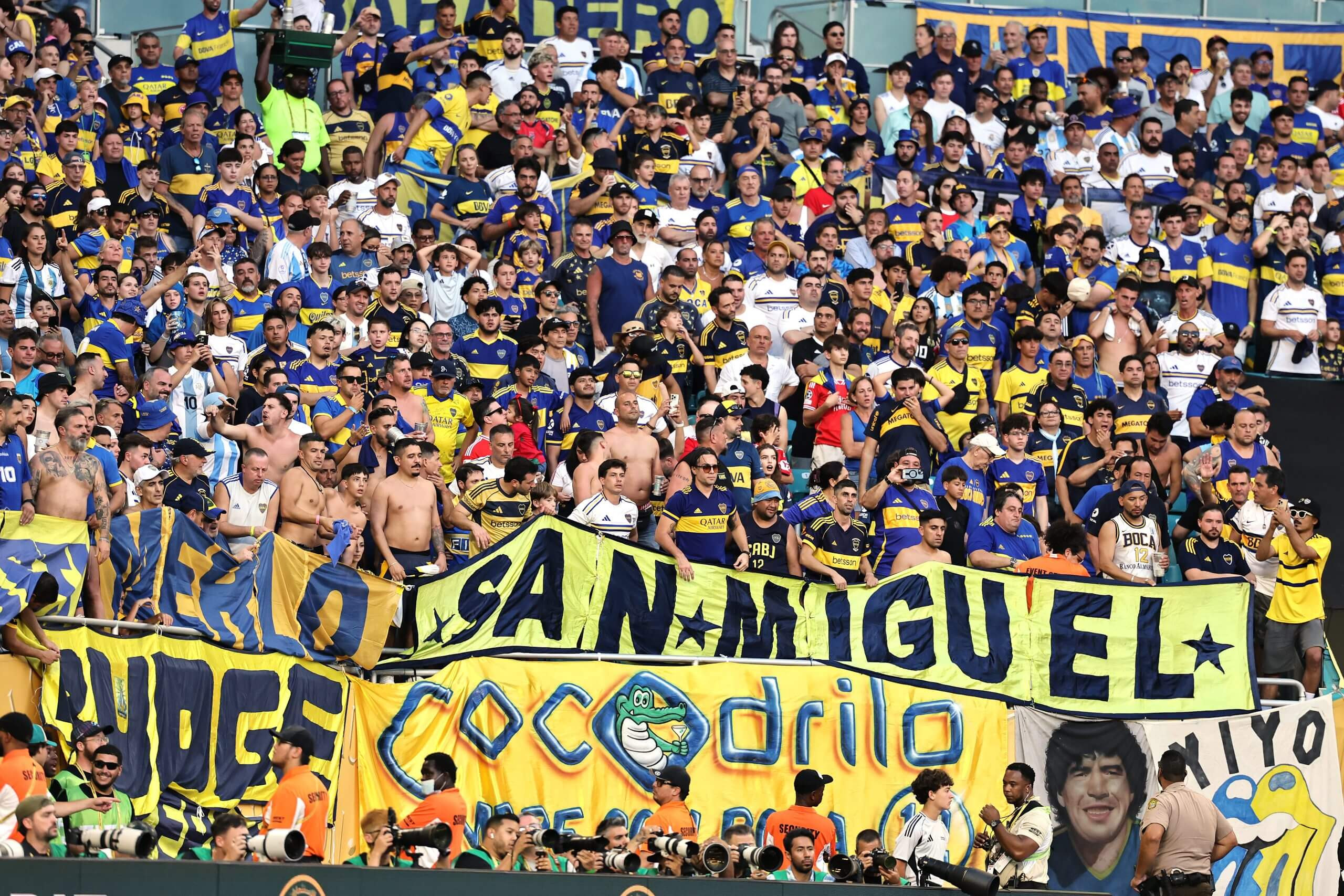 Người hâm mộ Boca Juniors cuồng nhiệt tại sân vận động Hard Rock, Miami, thể hiện niềm đam mê bóng đá cháy bỏng.