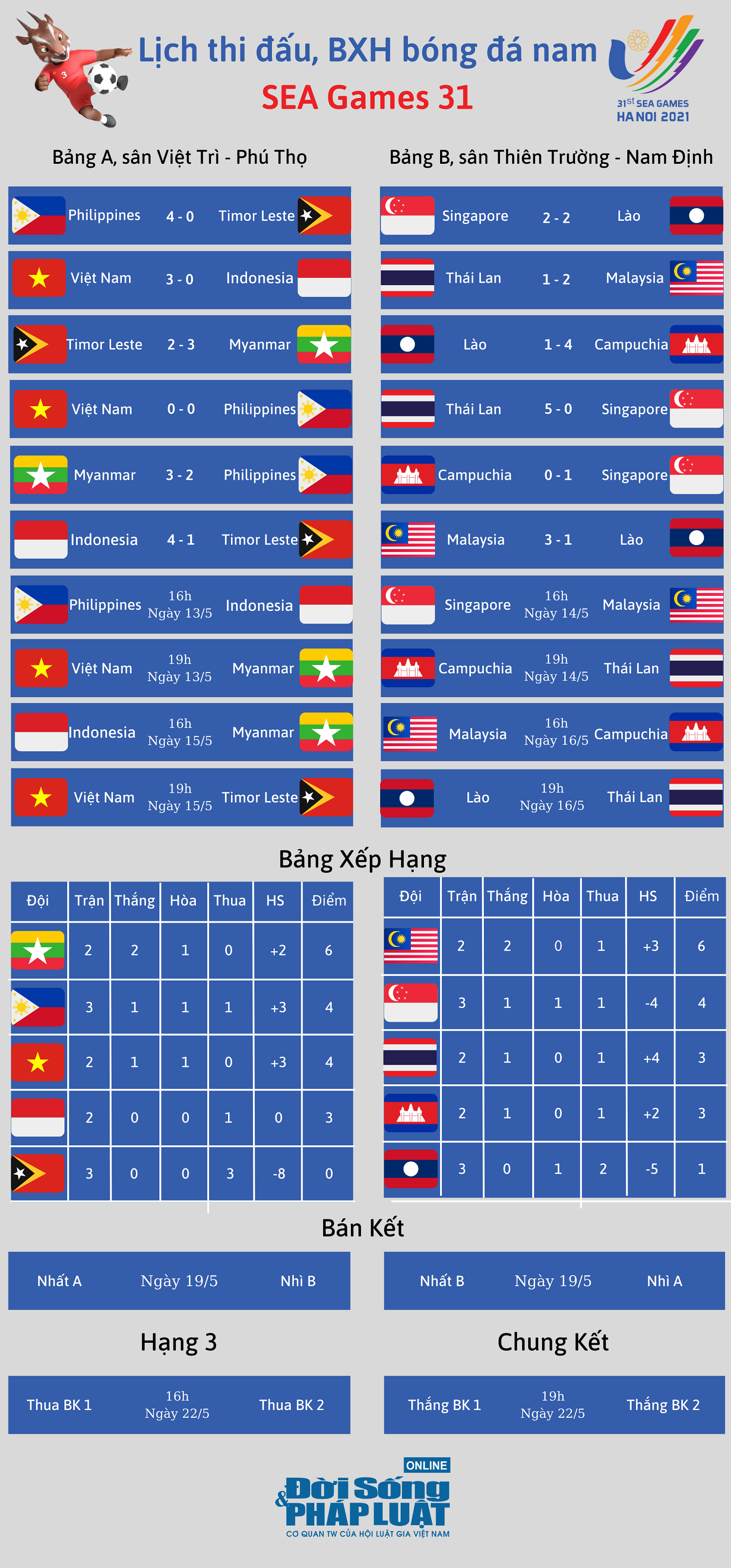 Bảng Xếp Hạng Vòng Bảng Bóng Đá Nam SEA Games 31