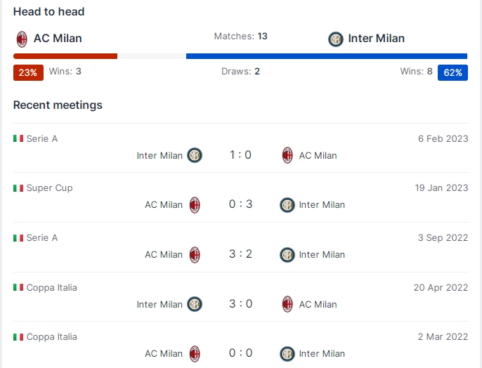 - Chiến thắng đậm nhất: Trận AC Milan 6-0 Inter Milan vào năm 2001.