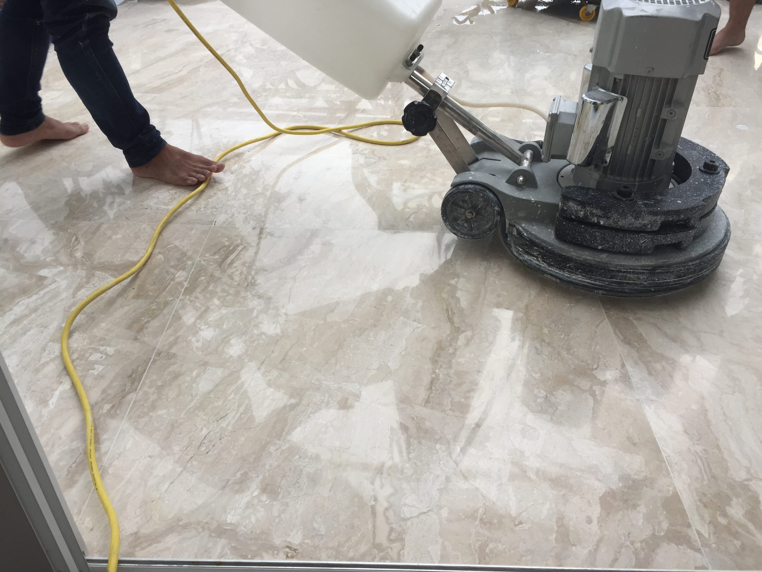 - Giai đoạn lỏng hóa: Ban đầu, hóa chất thường ở dạng kem hoặc sáp. Khi máy đánh bóng di chuyển nhanh và đều tay, hóa chất sẽ chuyển sang trạng thái lỏng do ma sát và nhiệt độ. Ở giai đoạn này, mục tiêu là phân tán đều hóa chất trên toàn bộ diện tích xử lý.