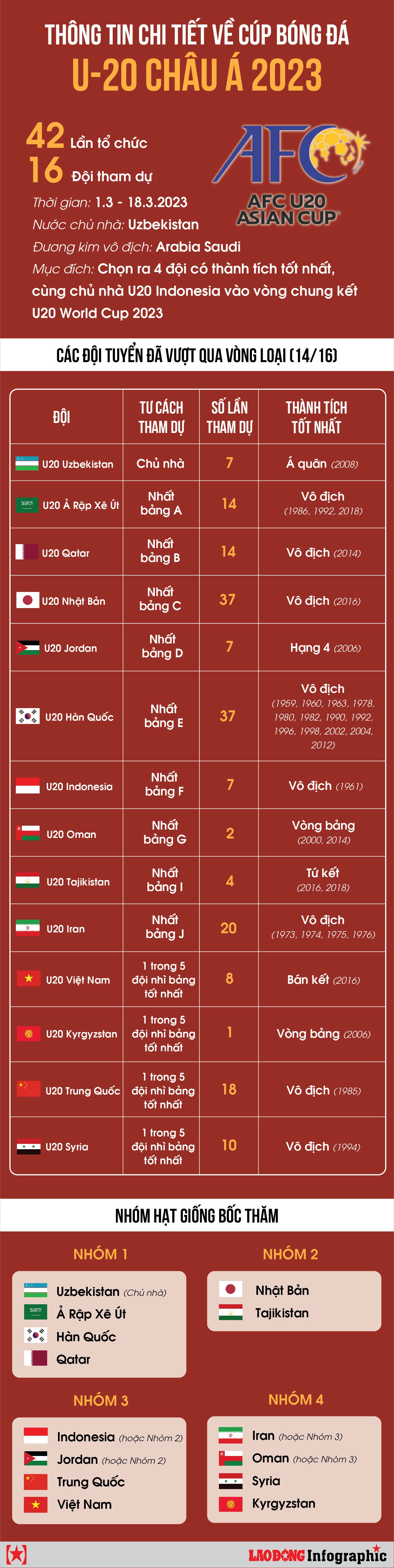 - Bảng B: Việt Nam, Úc, Qatar, Iran. Bảng B được mệnh danh là “bảng tử thần” với sự hiện diện của ba ông lớn bóng đá châu Á là Úc, Qatar và Iran, cùng với đại diện Đông Nam Á là U20 Việt Nam. Điều này tạo nên một thử thách cực lớn cho thầy trò HLV Hoàng Anh Tuấn.