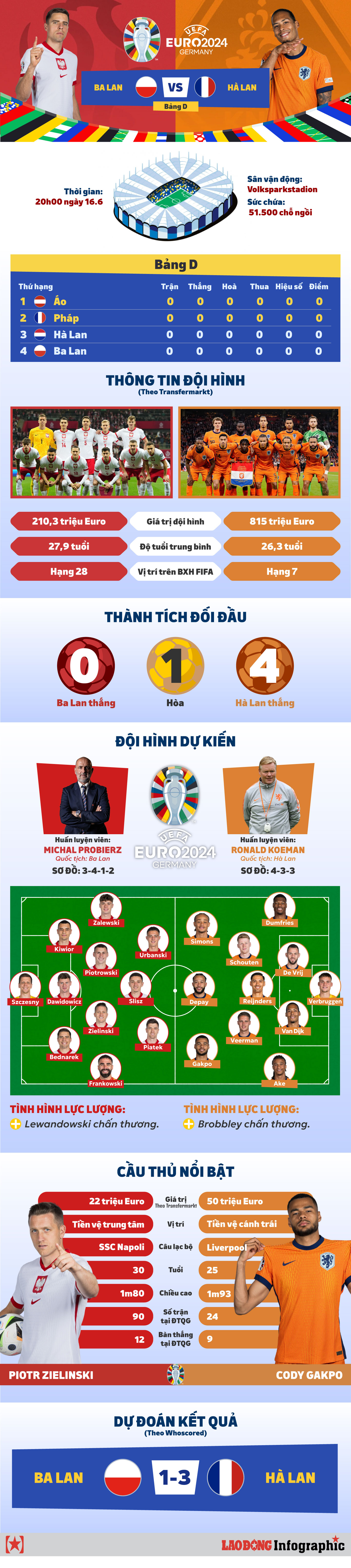 Hà Lan sở hữu một hàng thủ chắc chắn và một hàng công đa dạng, với Memphis Depay đang có phong độ cao. Dù thiếu vắng một số tiền vệ chủ chốt, chiều sâu đội hình và khả năng xoay sở của HLV Koeman vẫn đủ để họ áp đảo Ba Lan. Khả năng kiểm soát bóng, tạo ra áp lực liên tục và tận dụng cơ hội tốt hơn sẽ giúp Hà Lan giành chiến thắng trong trận đấu này. “Cơn lốc màu da cam” được kỳ vọng sẽ có một khởi đầu thuận lợi tại EURO 2024.