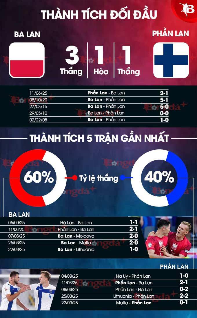 Trong 5 lần đối đầu gần nhất, Ba Lan chiếm ưu thế với 3 chiến thắng, 1 trận hòa và chỉ 1 thất bại trước Phần Lan. Điều này cho thấy Ba Lan thường có kết quả tốt khi đối đầu với Phần Lan, mang lại lợi thế về mặt tâm lý và kinh nghiệm. Yếu tố sân nhà cũng là một lợi thế không nhỏ cho Ba Lan. Sân vận động chật kín khán giả sẽ tạo nên bầu không khí cuồng nhiệt, tiếp thêm sức mạnh cho đội chủ nhà.