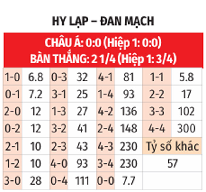 - Lẻ bàn thắng: 3/6 trận đối đầu gần nhất của hai đội có tổng số bàn thắng không chia hết cho 2. Tương tự, 3/5 trận gần đây của Hy Lạp và 4/5 trận mới nhất của Đan Mạch cũng chứng kiến điều này. Đây là một xu hướng khá phổ biến trong các trận đấu bóng đá có tính chất chặt chẽ.
