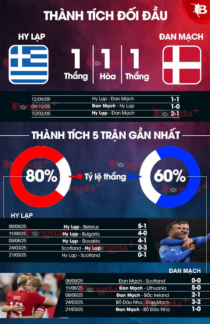 Phong độ của cả Hy Lạp và Đan Mạch đều rất đáng nể trong thời gian gần đây. Hy Lạp đã toàn thắng 4 trận đấu gần nhất, thể hiện sự ổn định và hiệu quả trong lối chơi. Đặc biệt, họ rất mạnh khi thi đấu trên sân nhà, với 4/5 trận thắng vừa qua diễn ra tại tổ ấm của mình. Đây sẽ là một lợi thế tâm lý lớn khi họ tiếp đón Đan Mạch.