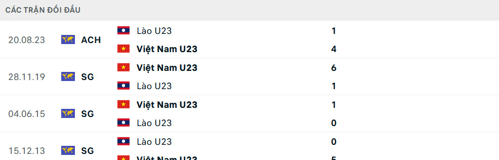 Hình ảnh: Bảng thống kê thành tích đối đầu giữa U23 Việt Nam và U23 Lào, minh chứng cho sự vượt trội của đội tuyển Việt Nam.