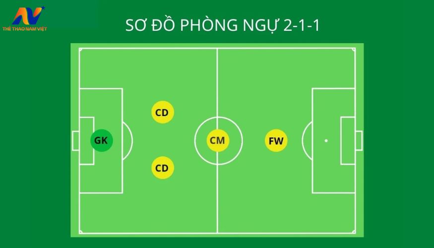 Sơ đồ 2-1-1, hay còn gọi là đội hình kim tự tháp, là một lựa chọn lý tưởng cho các đội bóng muốn ưu tiên sự chắc chắn trong phòng ngự và chờ đợi cơ hội phản công nhanh. Đây là sơ đồ thường được áp dụng khi đối đầu với đối thủ mạnh hơn hoặc trong những trận đấu mà mục tiêu chính là giữ vững tỷ số. Cấu trúc của sơ đồ này bao gồm 2 hậu vệ, 1 tiền vệ và 1 tiền đạo.