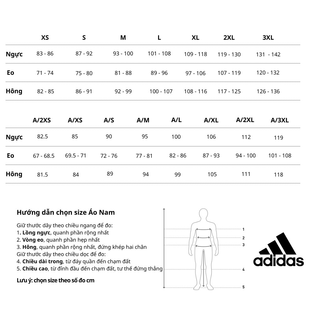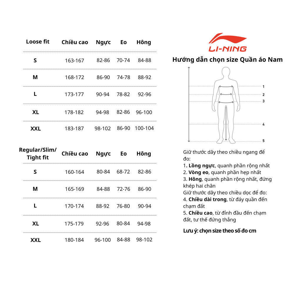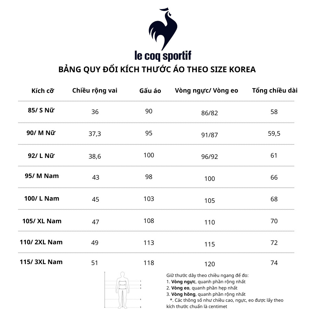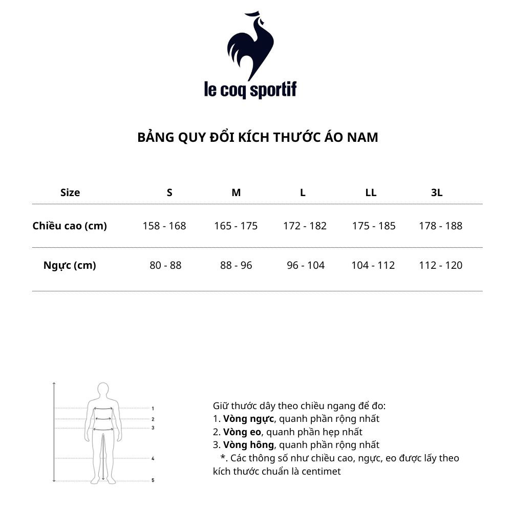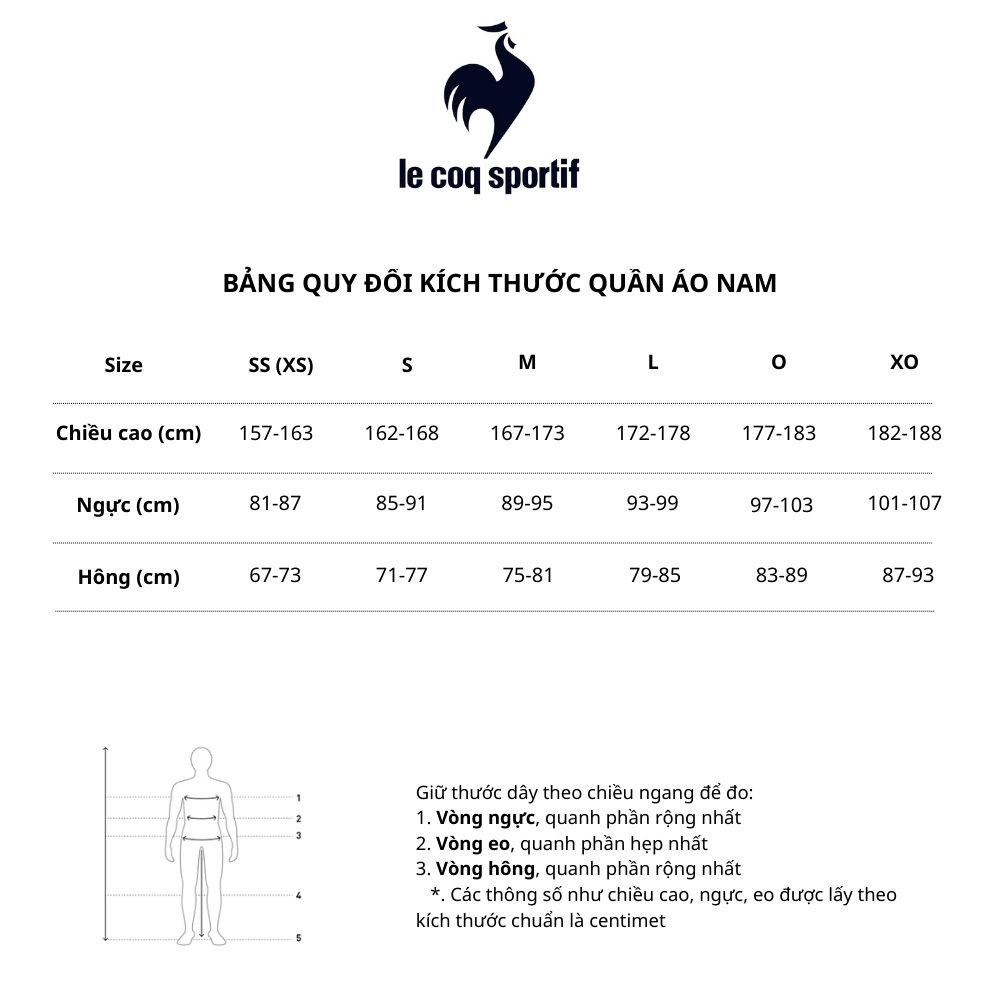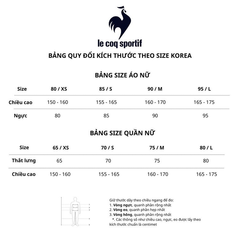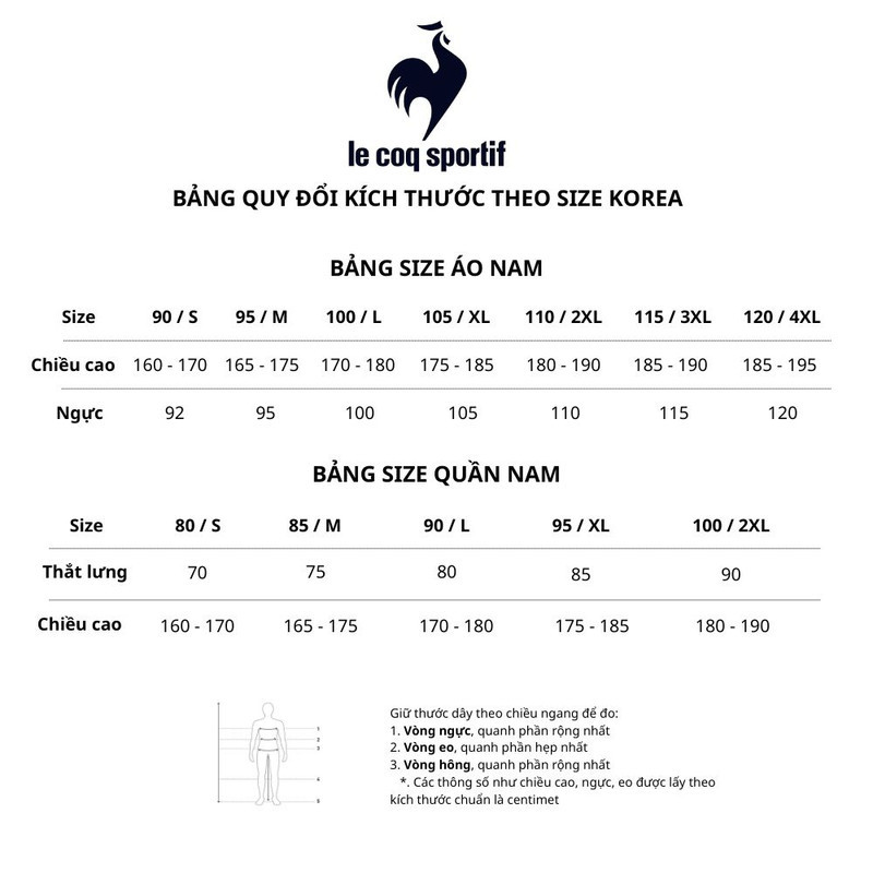 Bảng size quần áo nam Lecoq Korea, áp dụng cho các sản phẩm nhập khẩu