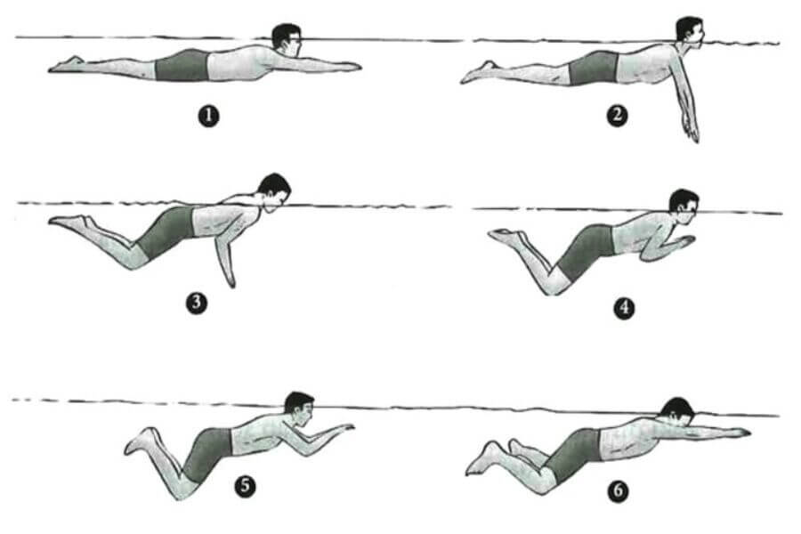 • Bài tập: Luyện tập tư thế thuôn dòng (streamline) bằng cách duỗi thẳng người, hai tay đặt chồng lên nhau phía trước, hai chân khép sát, và tập lướt trên mặt nước. Cảm nhận sự cân bằng và thẳng hàng của cơ thể.