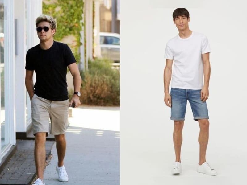 - Áo thun cơ bản và quần short kaki/jeans: Đây là công thức phối đồ kinh điển, không bao giờ lỗi mốt. Một chiếc áo thun cotton trơn màu (trắng, đen, xám, navy) kết hợp với quần short kaki hoặc jeans ống đứng là lựa chọn hoàn hảo cho những buổi dạo phố, cà phê cuối tuần hoặc đi chơi cùng bạn bè. Để nâng cấp outfit, bạn có thể chọn áo thun có họa tiết graphic đơn giản hoặc hình in độc đáo. Giày sneaker trắng hoặc các mẫu sneaker cổ điển như Converse, Vans sẽ là sự bổ sung tuyệt vời. Phụ kiện như mũ lưỡi trai và kính râm sẽ hoàn thiện vẻ ngoài năng động, phóng khoáng. Đảm bảo áo thun có độ ôm vừa phải, không quá rộng hoặc quá chật để giữ được vẻ ngoài gọn gàng.