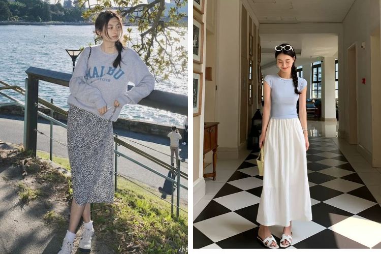 - Váy: Bên cạnh các mẫu chân váy ngắn (chữ A, xếp ly) và chân váy midi (xòe, bút chì), bạn có thể thử những mẫu váy liền form rộng rãi như váy babydoll (ngắn, xòe rộng), váy maxi (dài, bay bổng), hoặc váy lụa hai dây nhẹ nhàng. Những kiểu váy này không chỉ mang đến vẻ đẹp nữ tính, duyên dáng mà còn cực kỳ thoáng mát, giúp bạn tự tin di chuyển và chụp ảnh trong mọi khung cảnh. Váy liền là lựa chọn lý tưởng để giảm thiểu việc phải suy nghĩ phối đồ, chỉ cần kết hợp với một vài phụ kiện là đã có ngay một outfit hoàn chỉnh.
