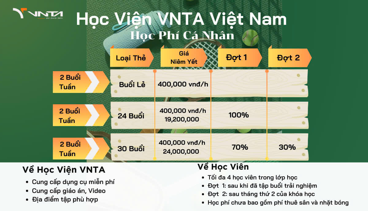 Trung tâm cung cấp các khóa học đa dạng và linh hoạt, bao gồm cả hình thức học trực tuyến và trực tiếp, học nhóm và học cá nhân, nhằm đáp ứng mọi nhu cầu của học viên. Chương trình học tại VNTA không chỉ chú trọng vào khía cạnh kỹ thuật mà còn tích hợp các yếu tố quan trọng khác như tâm lý, chiến thuật thi đấu, và dinh dưỡng thể thao. Điều này đảm bảo học viên được trang bị đầy đủ kiến thức và kỹ năng theo tiêu chuẩn hiện đại nhất. VNTA cũng hỗ trợ công cụ tập luyện và thường xuyên có các ưu đãi hấp dẫn cho học viên khi mua dụng cụ, cùng với các bài học được thiết kế riêng biệt để phù hợp với từng cá nhân. Các địa điểm tập luyện của VNTA thường nằm ở vị trí thuận tiện, dễ dàng cho việc đi lại.